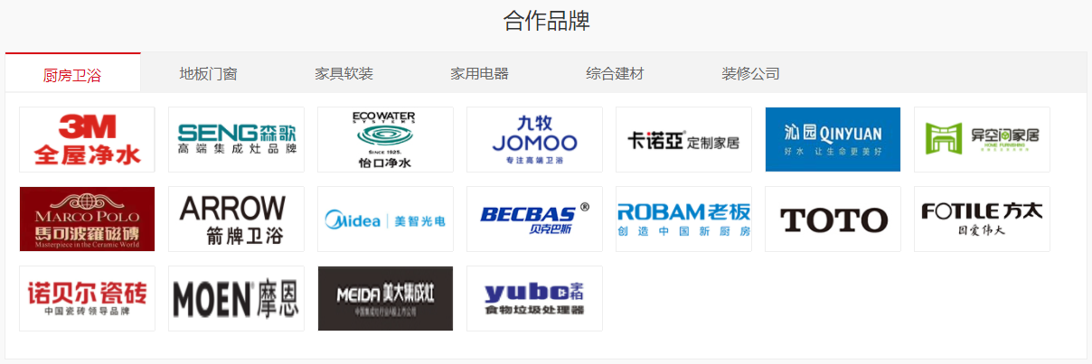 一,厨房卫浴:3M、森歌集成灶、 怡口净水、九牧卫浴、卡诺亚定制家居、沁园净水、异空间家居、马可波罗、箭牌卫浴、美的浴霸、gy-贝克巴斯、老板电器、TOTO卫浴、方太电器、诺贝尔磁砖、摩恩卫浴、美大集成灶、宇柏垃圾处理器