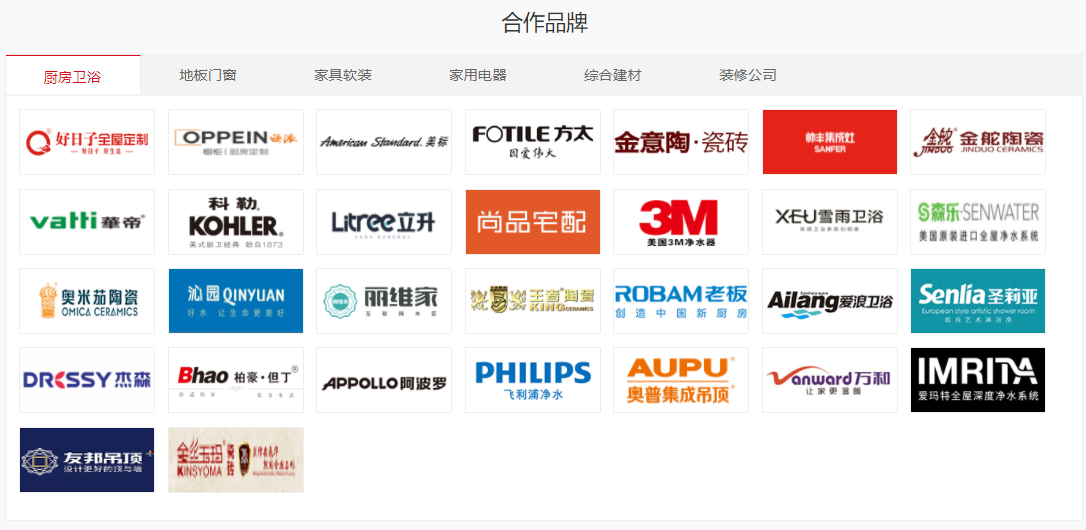 一,厨房卫浴:好日子全屋定制、欧派橱柜、 美标卫浴、方太电器、金意陶瓷砖、帅丰集成灶、金舵陶瓷、华帝厨电、科勒卫浴、立升净水、尚品宅配、3M净水 、雪雨卫浴、美国森乐净水、奥米茄陶瓷、沁园净水器、丽维家全屋定制家居、王者陶瓷、老板电器、爱浪卫浴、圣莉亚淋浴房、杰森集成灶、柏豪但丁橱柜衣柜、阿波罗卫浴、飞利浦净水、奥普集成吊顶、万和电器、爱玛特净水、友邦集成吊顶、金丝玉玛